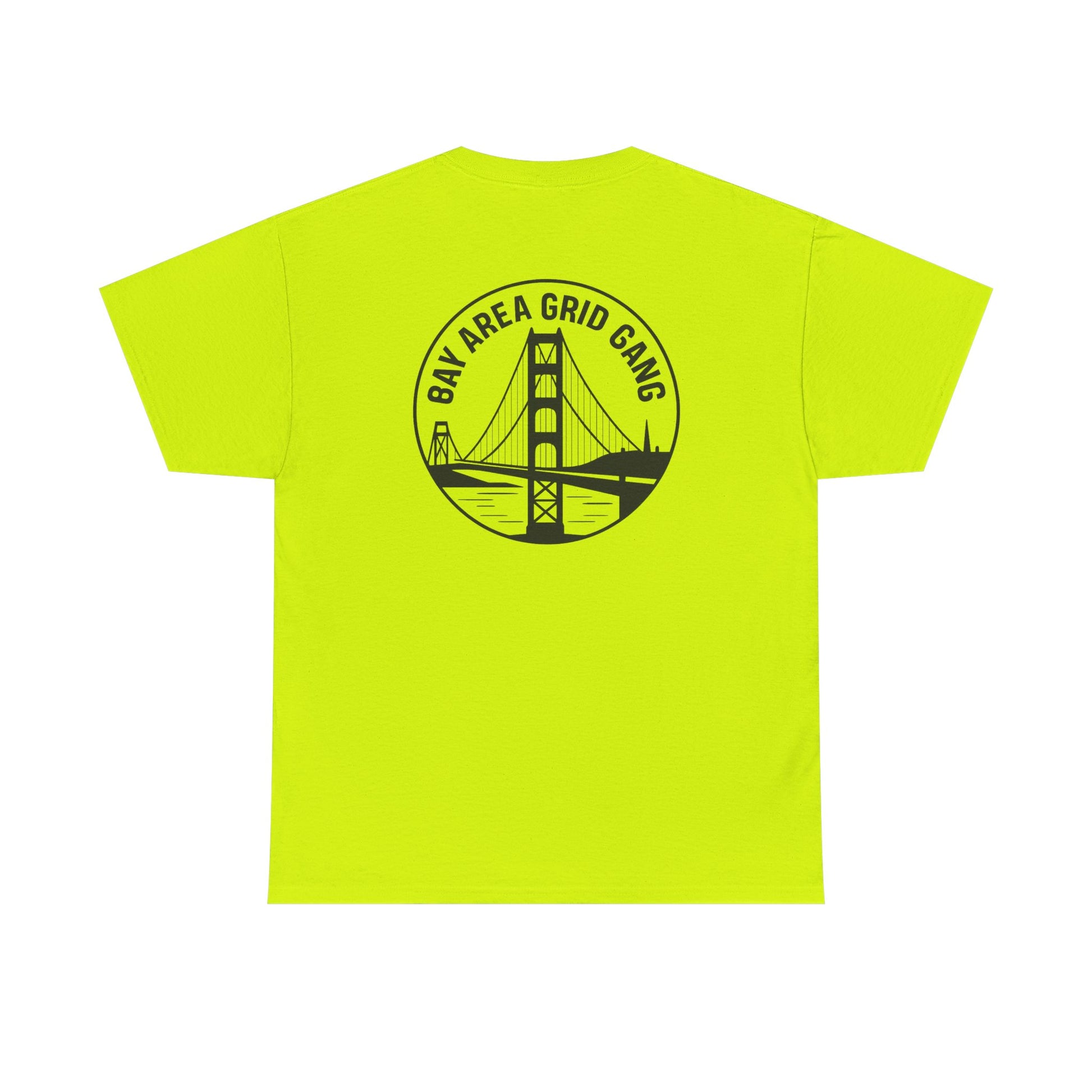 A trendy and stylish T-Shirt featuring a design of "Bay Area Grid Gang" with Golden Gate Bridge on Safety colors.