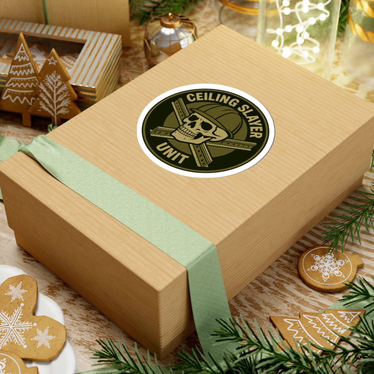 “Ceiling Slayer Unit” with skull and grid cross. Military patch inspired kiss-cut sticker