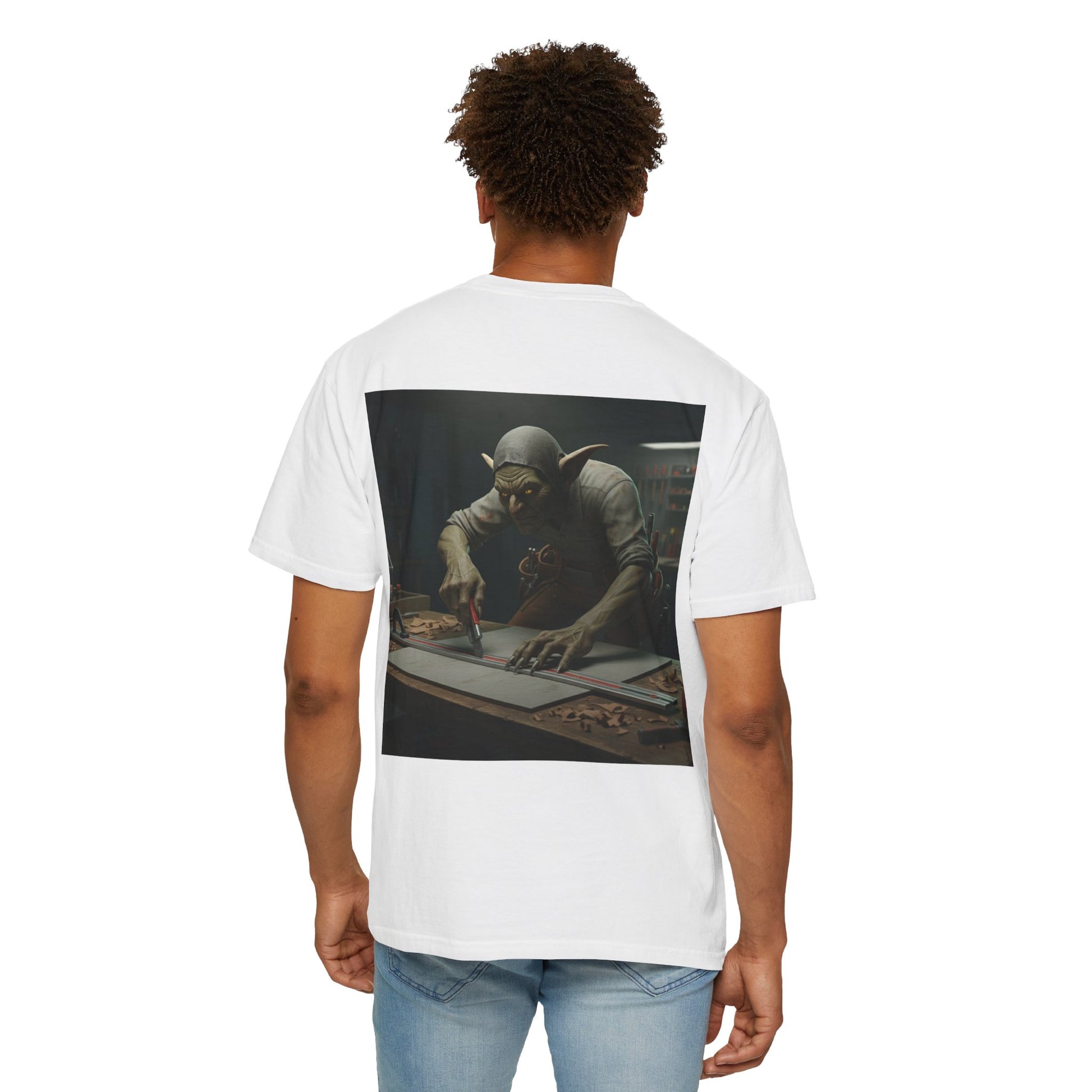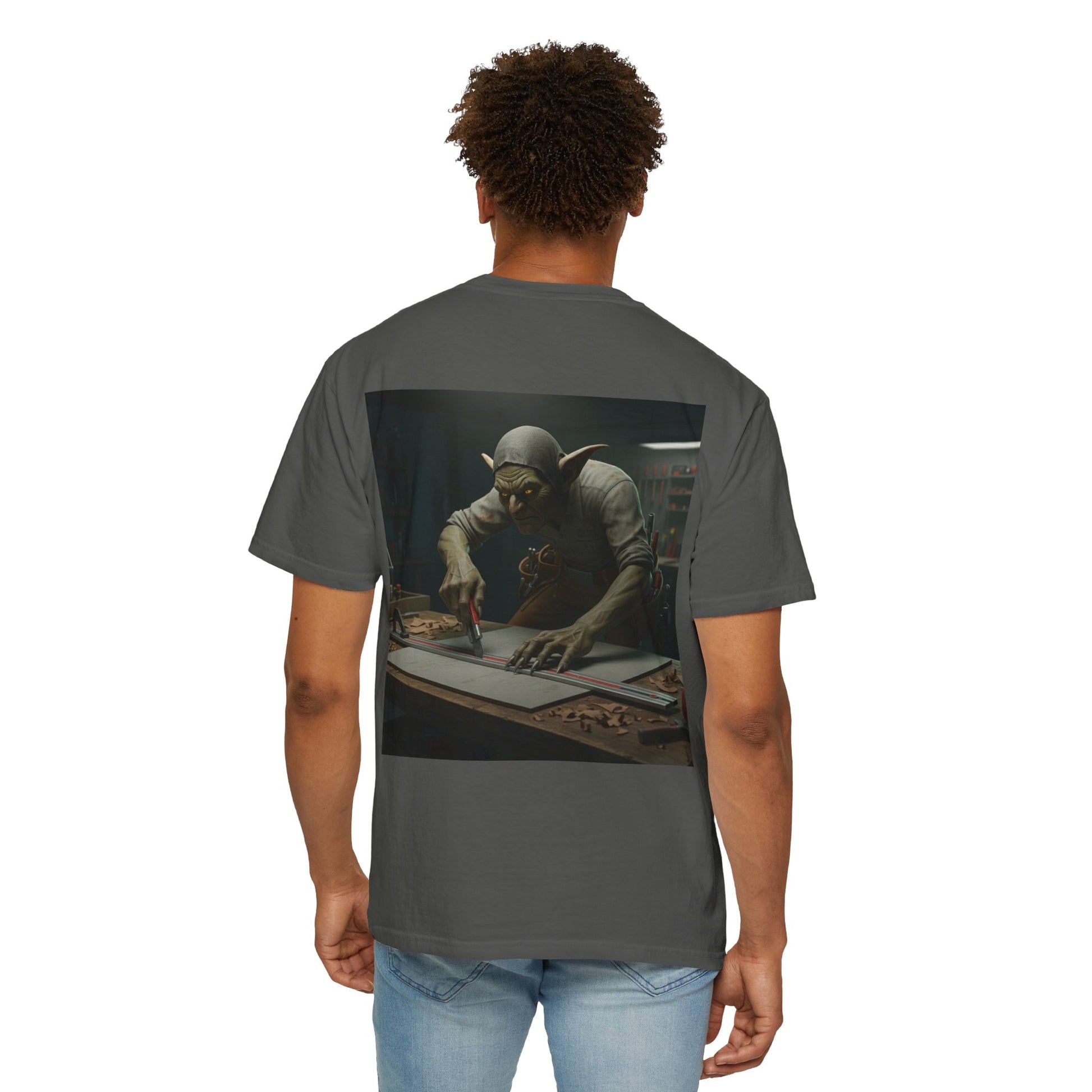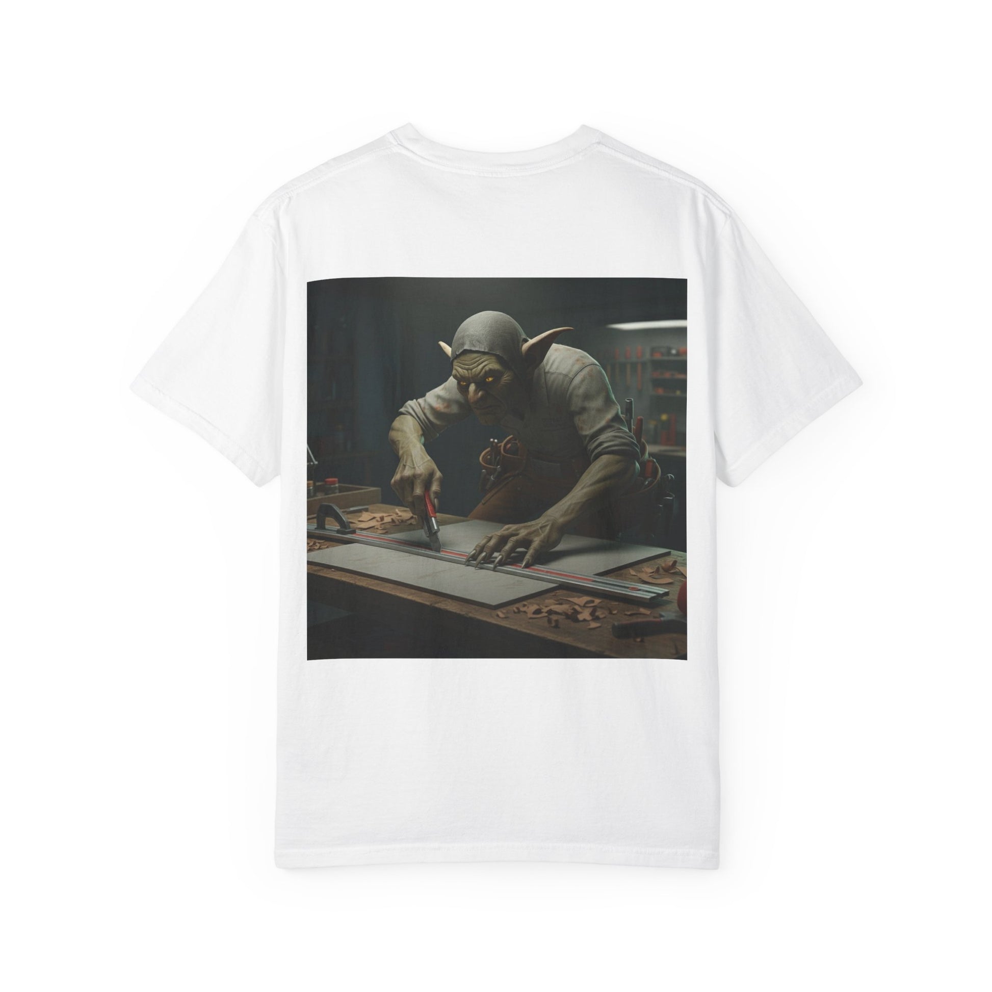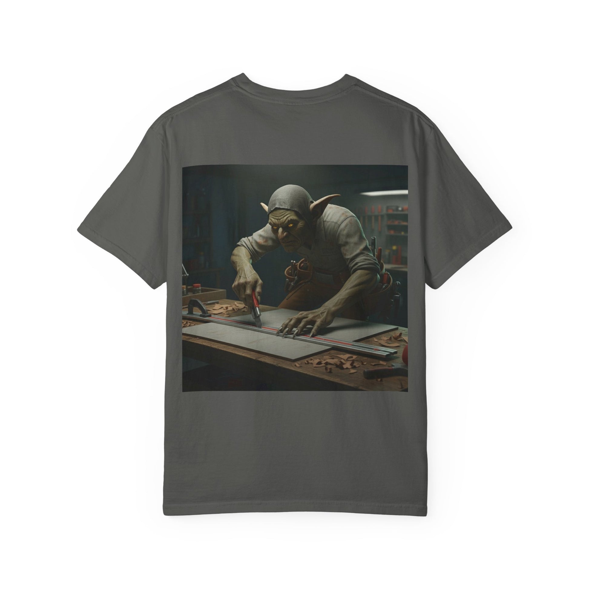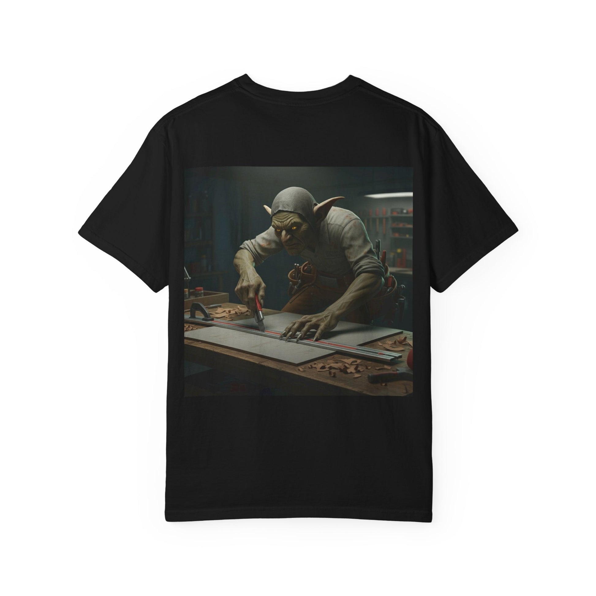 Horror fantasy T-shirt featuring Grid Goblin using a straight edge to cut a panel to size. This unique design gives off a dark and mysterious vibe, perfect for fans of horror and fantasy genres. It is a great addition to a casual wardrobe and can be worn to Halloween parties, horror movie marathons, or comic conventions. The garment-dyed fabric and double-needle stitching ensure durability and comfort for the wearer.