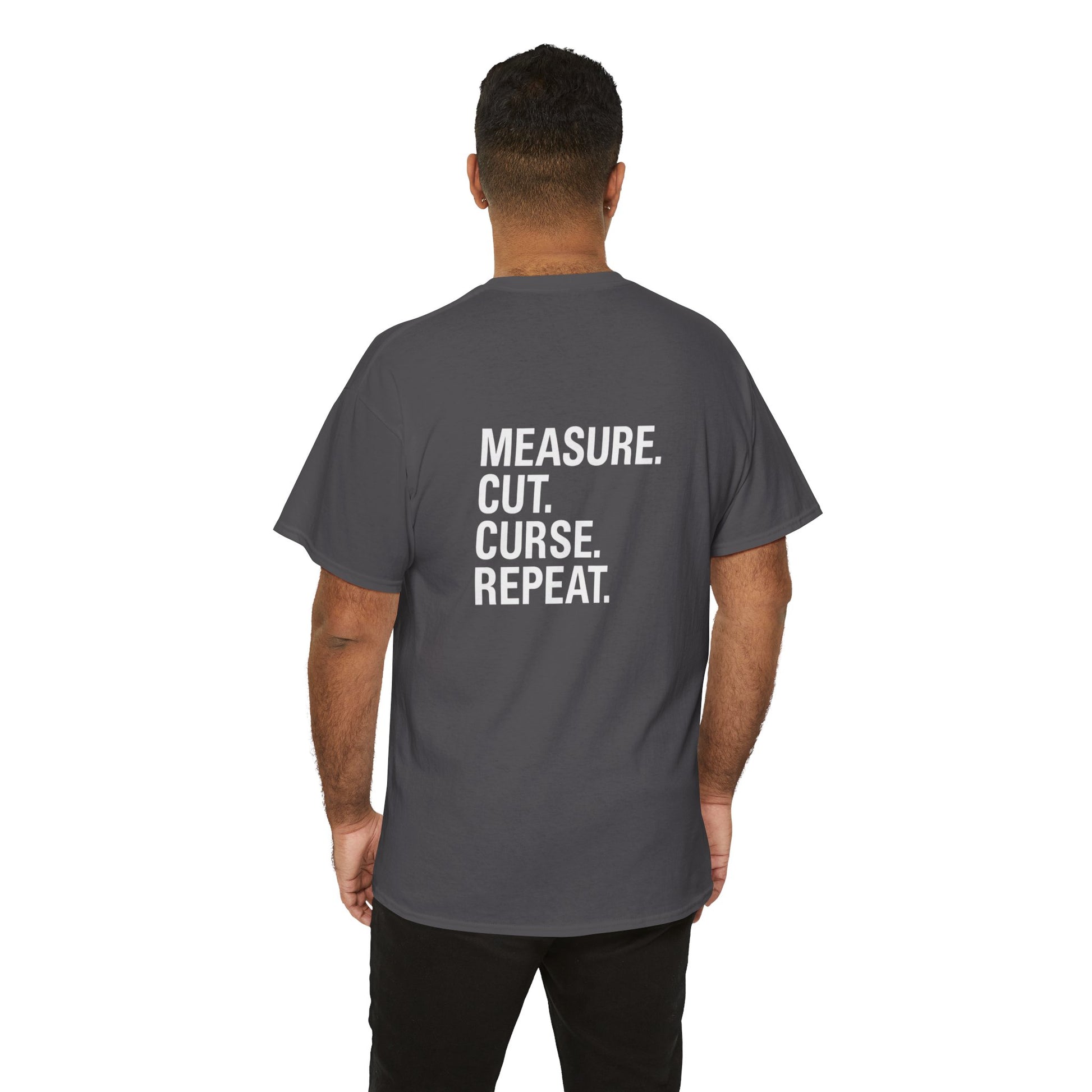 'Measure Cut Curse Repeat' T-shirt. Perfect for carpenters, ceiling installers, and DIY enthusiasts.