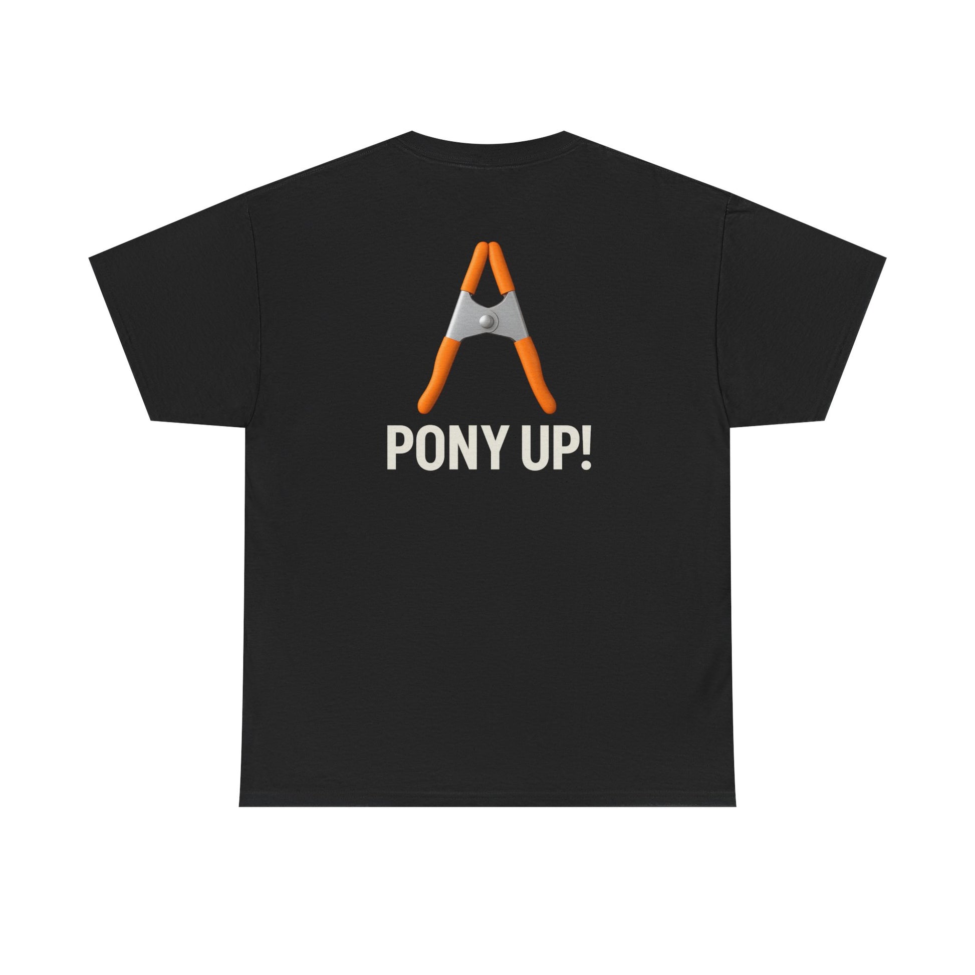 Keywords: pony up shirt, ceiling installer t-shirt, drop ceiling apparel, pony clamp tee, grid hanger shirt, construction workwear, Overhead Outfitters, Gildan 2000 Ultra Cotton