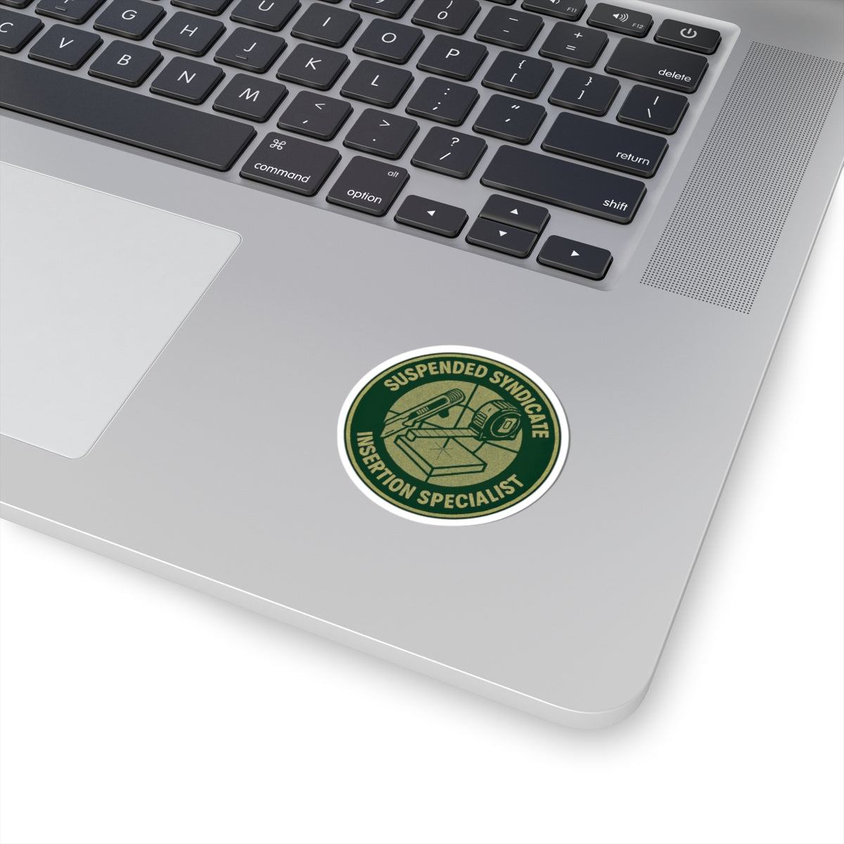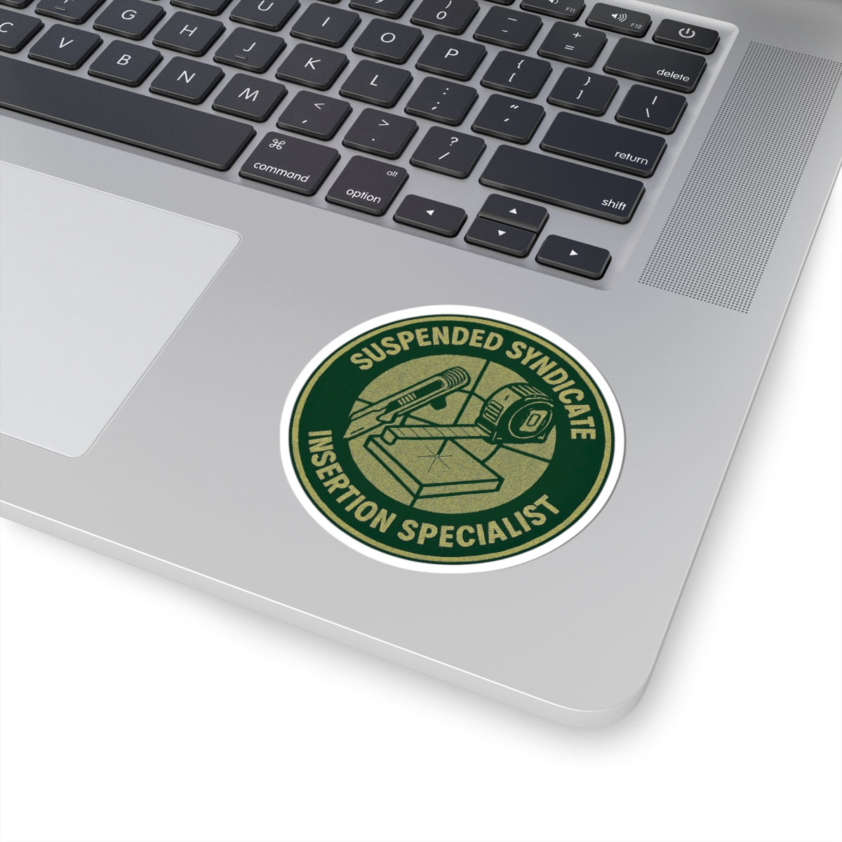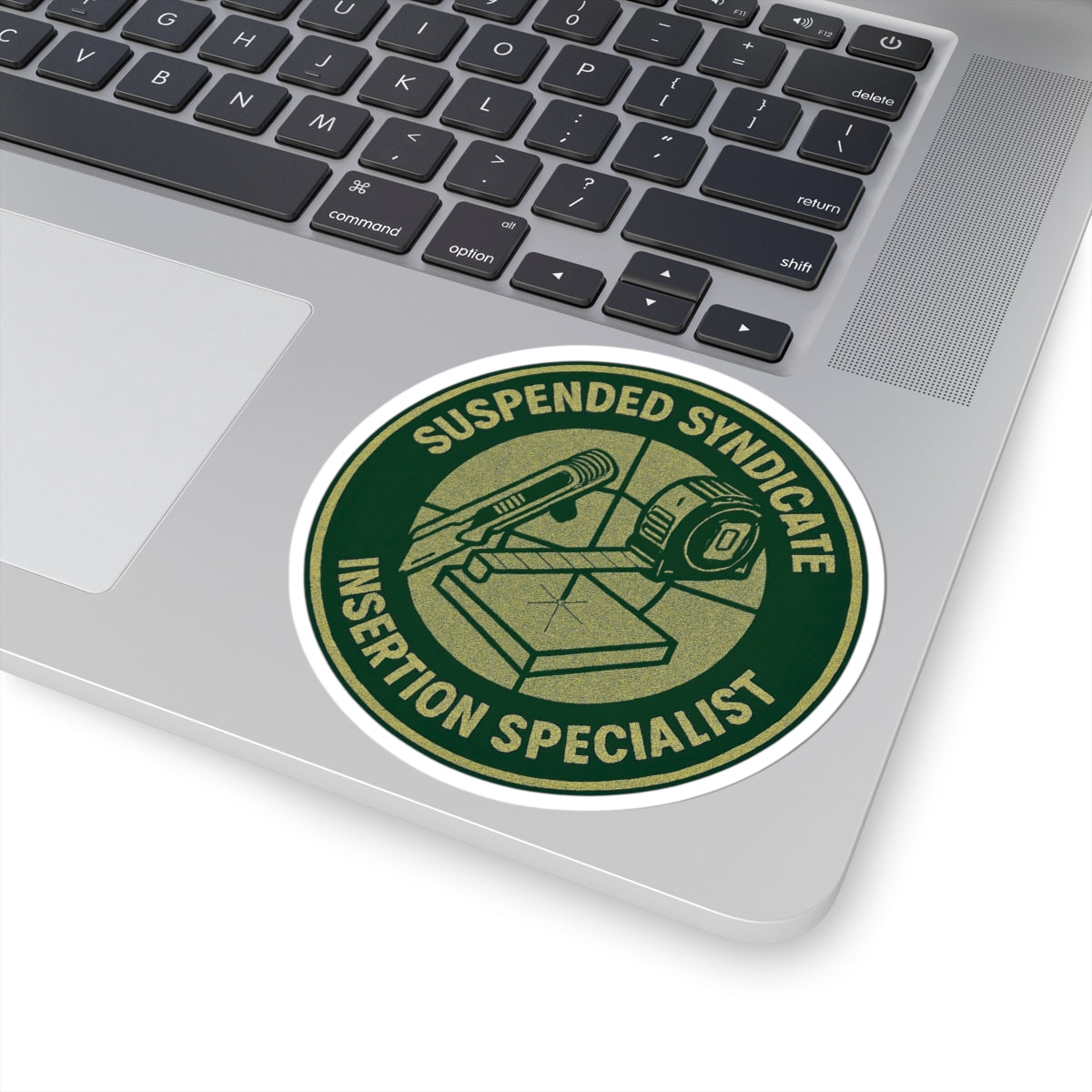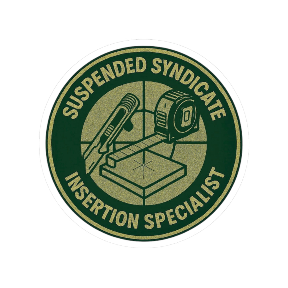 “Suspended Syndicate. Insertion Specialist” kiss-cut sticker