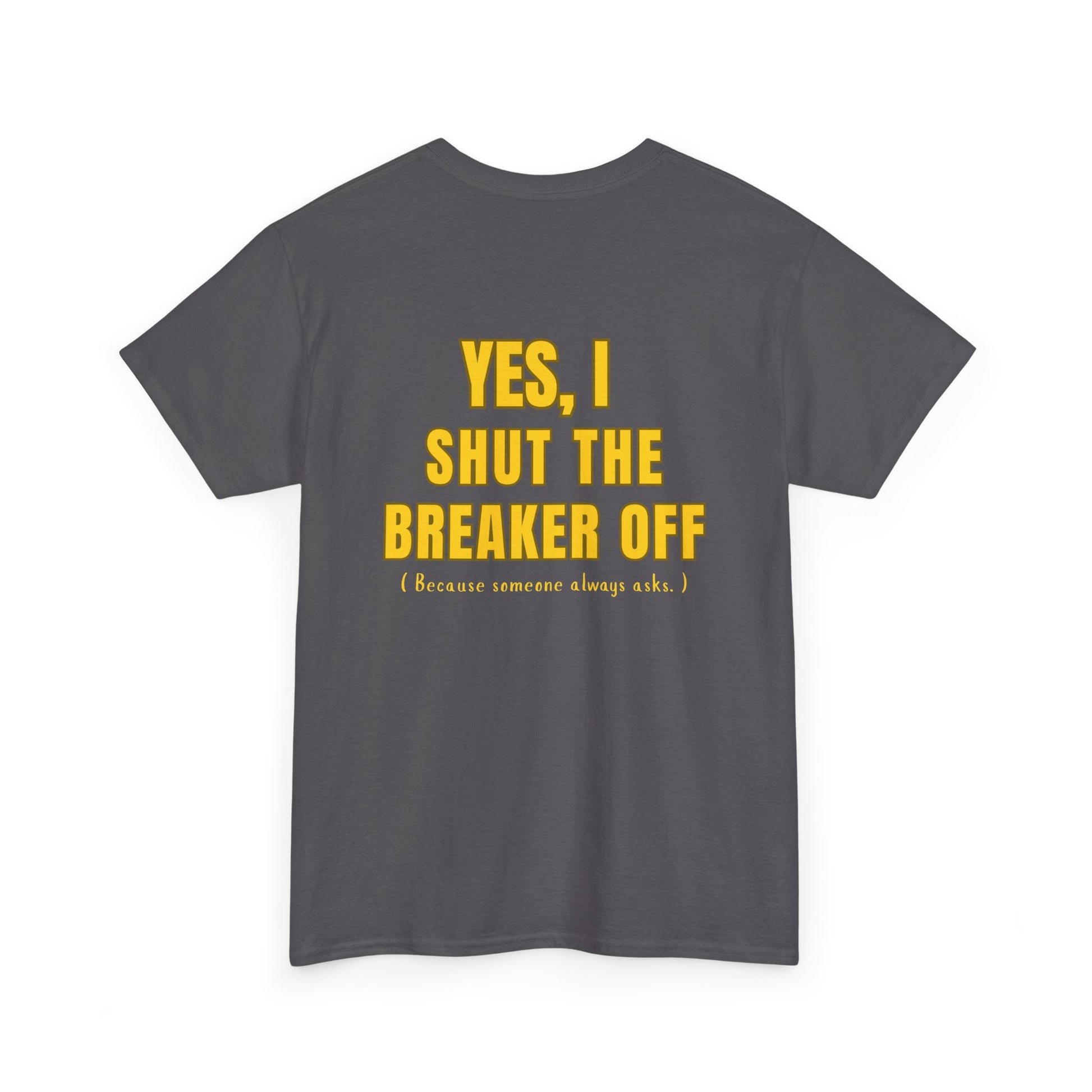 This one’s for every electrician who’s heard it a thousand times: “You shut the breaker off?” Clean, bold, and jobsite-funny — printed as a full back statement that gets laughs without trying too hard.