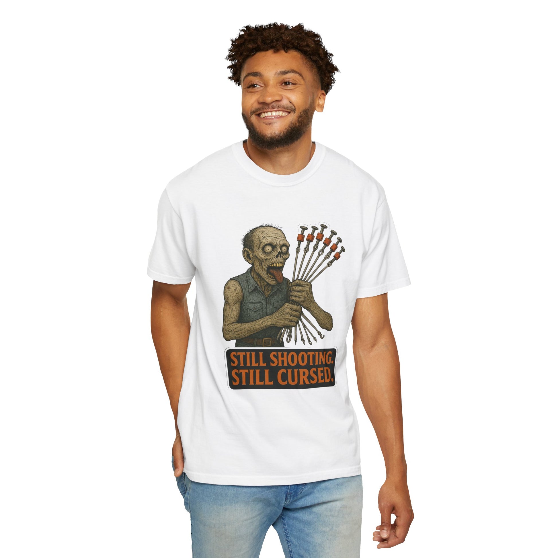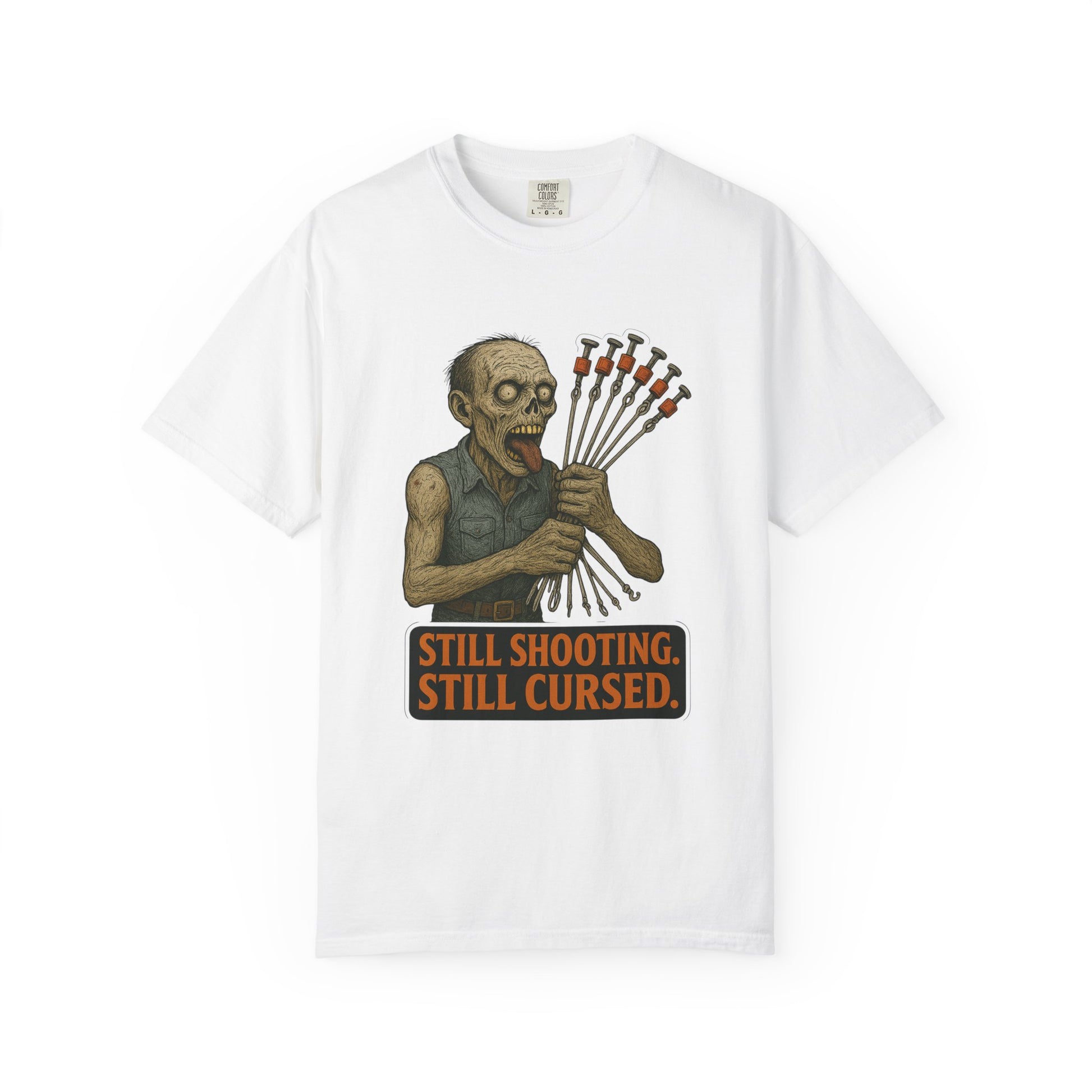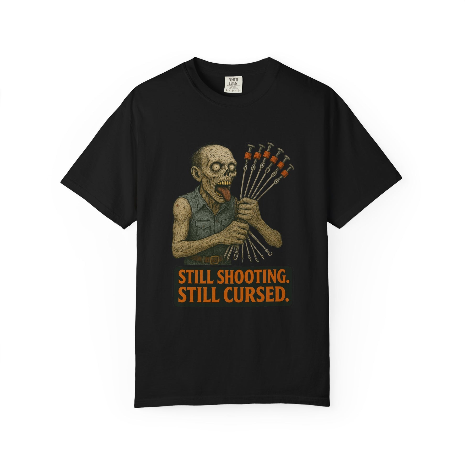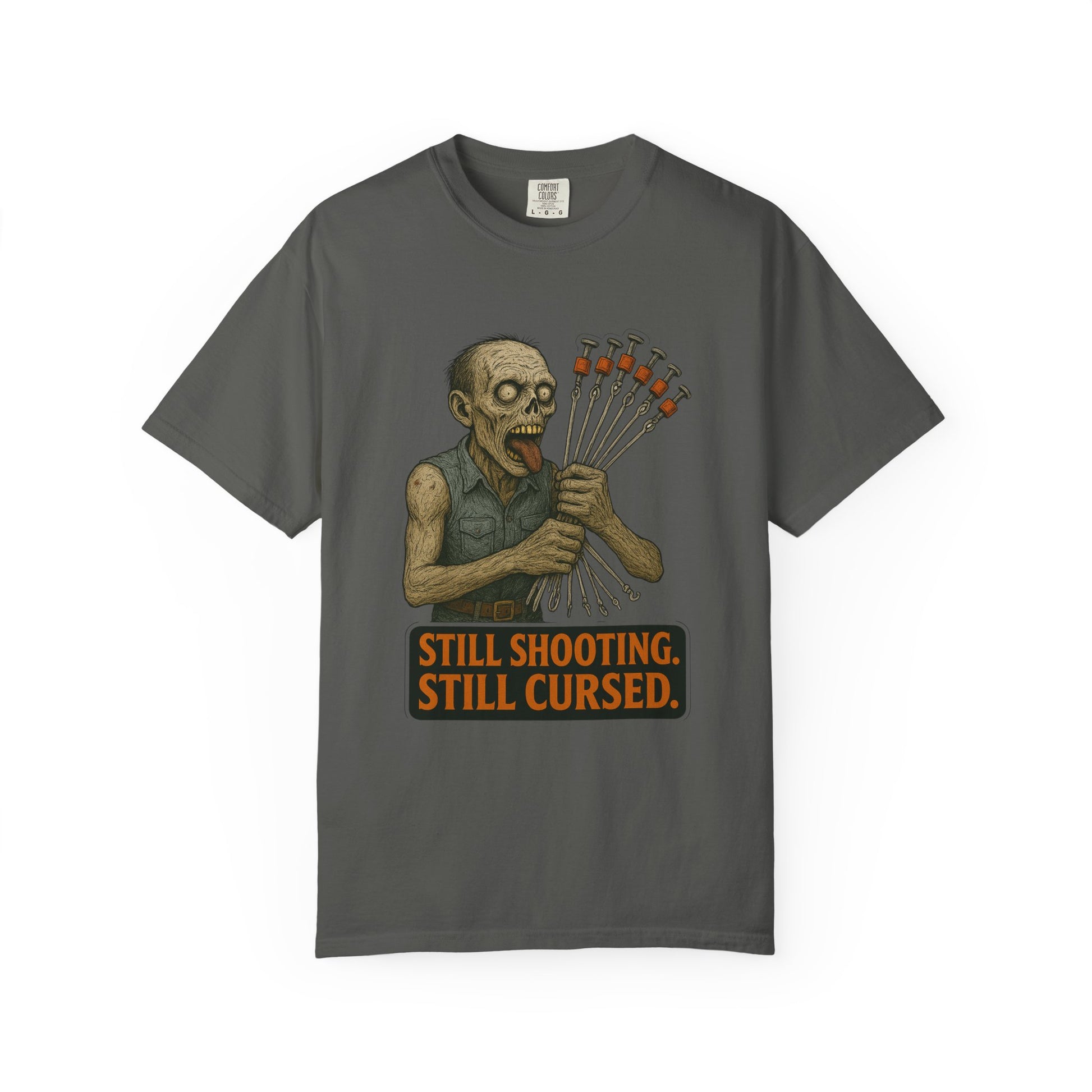 “Still Shooting. Still Cursed” (print on front) Zombie Ceiling Wire Shooter shirt
